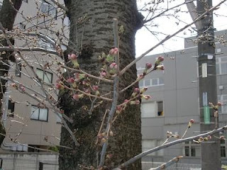 桜の木を見たら、つぼみがかなり膨らんでいます。