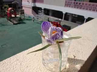 そして、2階の年長の部屋の前に行くと、これまた去年の冬から育て始めた、水栽培のクロッカスの花が咲いていました。