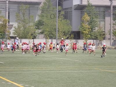 年中組が走っています。「よ~いどん!!」 何回も何回も走っていましたよ。