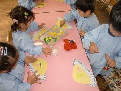 園での日々のようす 2010年5月27日2018年3月28日のり制作~年少組~ 今日は、年少組がのりを使って制作を行いました。お皿にのっているご飯に、色画用紙を切って作った、「ピーマン」「きゃべつ」「ハム」などをのりで貼ります。 どの子も一生懸命。指先にちょっとだけのりを付けて、具材に塗り、ご飯に貼っていきます。 そして、美味しそうな「チャーハン」が出来上がりました。部屋のピンクボードに貼ってありますので、是非ご覧下さい。(午前中に作っていましたが、見ていてお腹がすいてきました!!) 投稿ナビゲーション 前へ次へ 一覧へ戻る HOME 園での日々のようす のり制作~年少組~