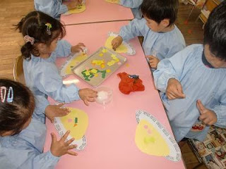 2010年5月27日2018年3月28日のり制作~年少組~ 今日は、年少組がのりを使って制作を行いました。お皿にのっているご飯に、色画用紙を切って作った、「ピーマン」「きゃべつ」「ハム」などをのりで貼ります。 どの子も一生懸命。指先にちょっとだけのりを付けて、具材に塗り、ご飯に貼っていきます。 そして、美味しそうな「チャーハン」が出来上がりました。部屋のピンクボードに貼ってありますので、是非ご覧下さい。(午前中に作っていましたが、見ていてお腹がすいてきました!!) 投稿ナビゲーション 前へ次へ