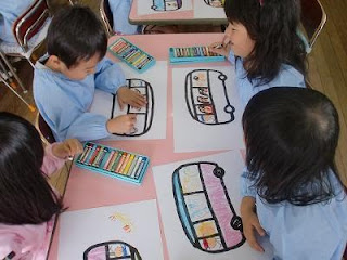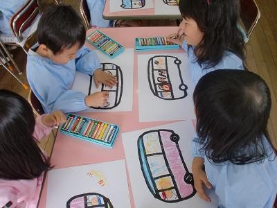 真っ白な紙に描きはじめるのは難しい子もいるので、紙にバスのラインを描いたものを子ども達に渡しました。
