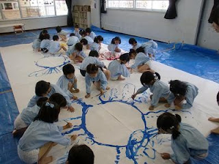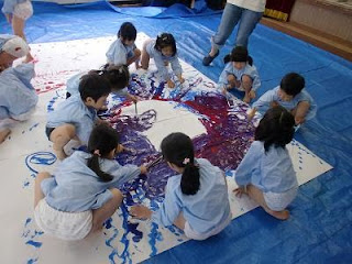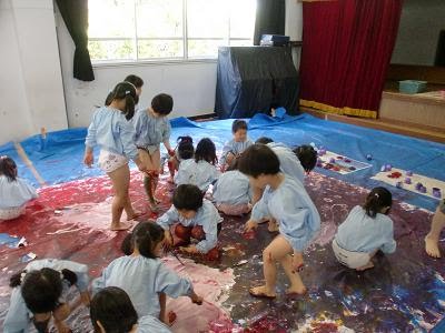 子ども達は、その色の変化を楽しみ、筆だけでなく、手も足も、中には髪の毛、顔にも絵の具をつけながら遊んでいました。