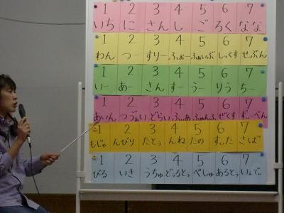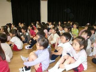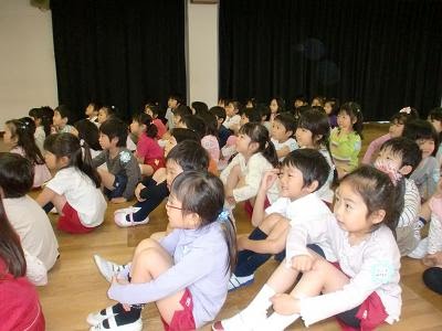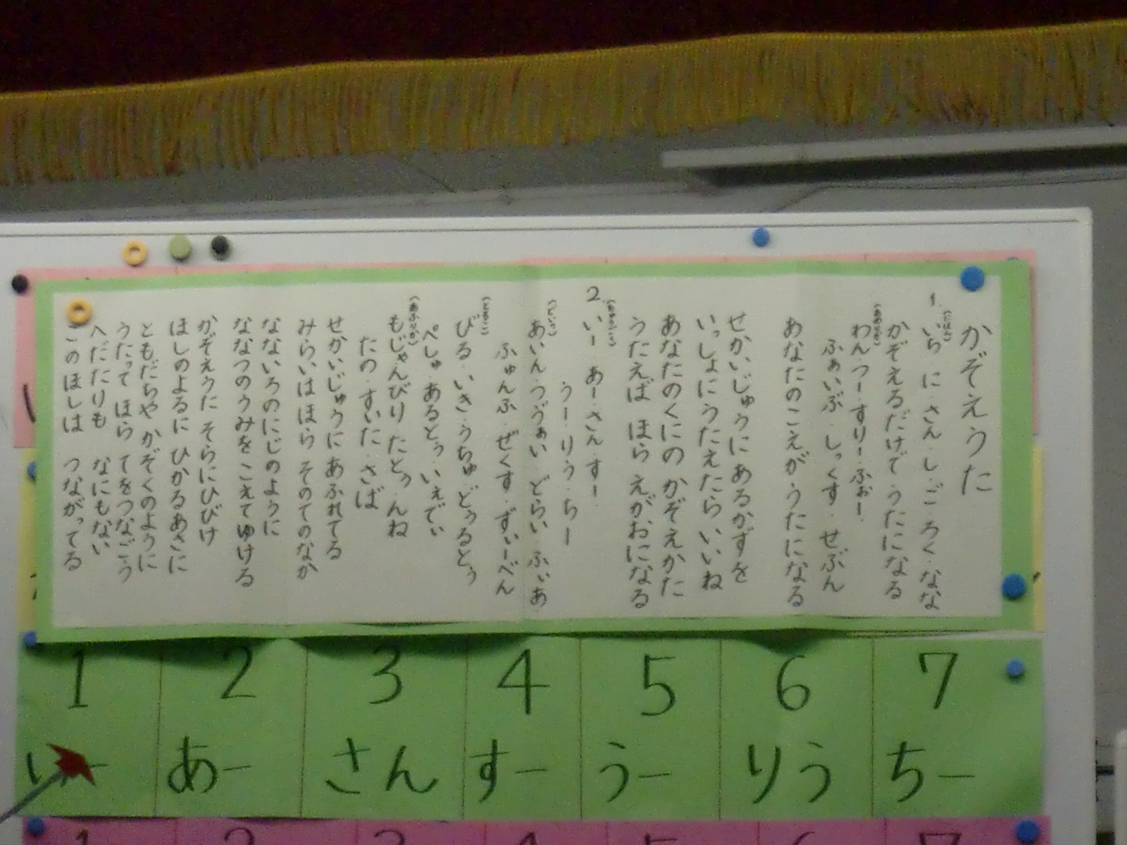 今日は、年長組が遊戯室に集まり、新しい歌を教えてもらう「うた集会」がありました。