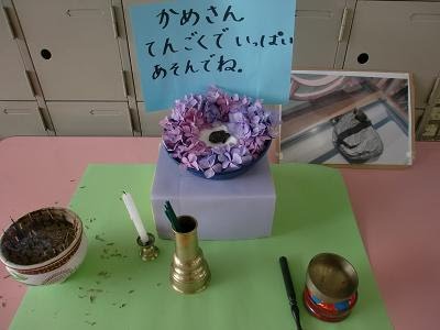 朝登園する前に、玄関にカメの棺とお線香などを準備しました。