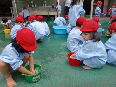 2010年6月24日2018年3月28日洗濯あそび 今日は年少組が洗濯あそびを行いました。家から持ってきてもらったハンカチを、ごしごし・・・ バケツの中で、一生懸命洗っていました。(もともと綺麗なハンカチですが・・・) 洗い終わったら、ロープに干して洗濯ばさみで留めていました。 暑い日には、洗濯あそびや水あそびなどを行います。パンツと仕事着で行います。塗れたり汚れたりして、持ち帰ったら、翌日補充をお願いします。 投稿ナビゲーション 前へ次へ