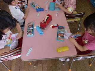 先日、年中組はティッシュの空き箱を使って、車を作りました。