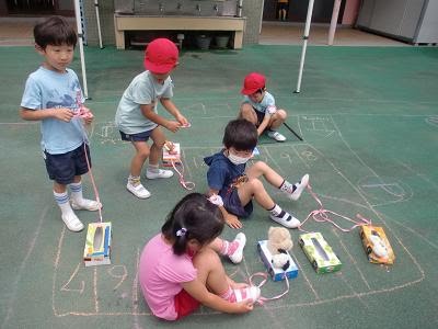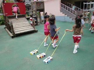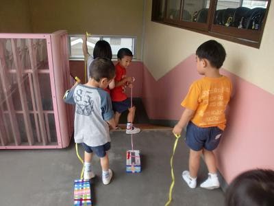タイヤも付けて、車の完成。紐をつけて、園庭へ向かいます。階段は気をつけてね!
