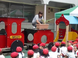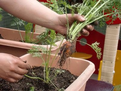 今日のおはよう体操のときに、園庭のプランターで育っている「にんじん」を収穫してみることに。