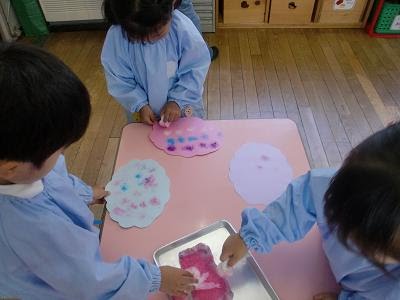 園での日々のようす 2010年6月17日2018年3月28日たんぽ遊び~ひよこ組~ ひよこぐみは、たんぽ遊びをしました。最近幼稚園の庭に綺麗に咲いているアジサイを見て、アジサイを作ってみようということで、色のついた紙にたんぽ(ガーゼの中に脱脂綿を入れて、ゴムでしぼったもの)でピンクや白、青、紫などの色をつけました。とても綺麗に出来たね。 投稿ナビゲーション 前へ次へ 一覧へ戻る HOME 園での日々のようす たんぽ遊び~ひよこ組~