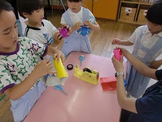 先週もにこにこタイムの時間に、菊名で行われる七夕飾り大作戦に使う、七夕飾りを作りました。