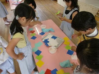 まずは、「四角つなぎ」。のりでつけています。 こちらは、「ちょうちん」を作っています。