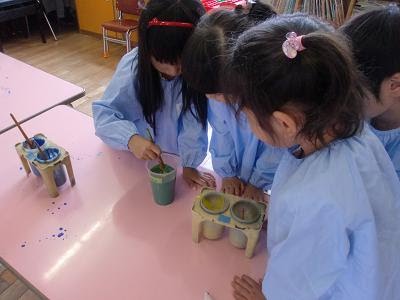 2010年6月15日2018年3月28日6月15日年長組 年長組の部屋を覗きに行くと、なにやら真剣に絵の具を作っています。 友達と一緒に色を作り、試しに描いています。 何をしていたのかと言うと、昨日クレヨンで描いていた「しゃぼん玉の絵」のしゃぼん玉に色を付けるとの事。そのための色を赤・青・黄色・白の絵の具を調合して作っていたのです。 描いていると、クレヨンのところは残り、しゃぼん玉に綺麗な色が付きました。 とても可愛いしゃぼん玉の絵が出来上がったようです。 是非見てあげてくださいね。 投稿ナビゲーション 前へ次へ