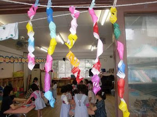 きょうの「にこにこタイム」では、「七夕笹飾り大作戦」のことを子どもに伝え、今日は2種類の飾りの作り方を伝え、作ってみました。