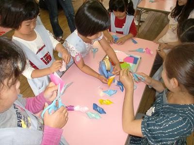 折り紙を半分に折り、切込みをいれます。出来たものを広げ、対角線上の角を合わせます。 簡単な説明だけでしたが、みんなとても上手。