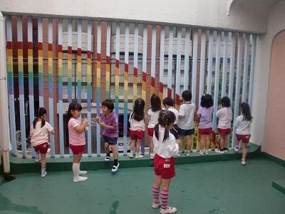 虹のテラスでは、「歩いている人を驚かせちゃおう!!」と道路に向かって吹いている子もいましたよ。