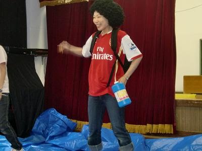 遊戯室に集まると、以前歌を教えてくれた「もじゃ」が来ました。 しゃぼん玉液を持ってきてくれ、膨らませて見せてくれました。