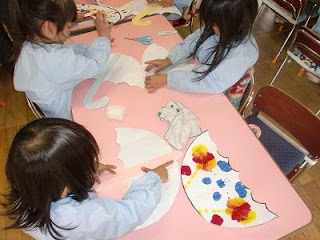 歌をうたった後、以前楽しんだ絵の具のデカルコマニー(絵の具をたらした紙を半分に折り、そっと広げると素敵な模様が出てくるというもの)の紙を傘の形に切っていました。