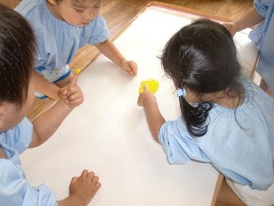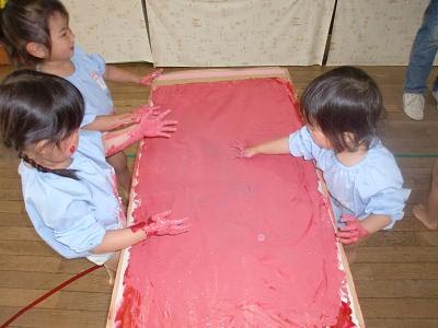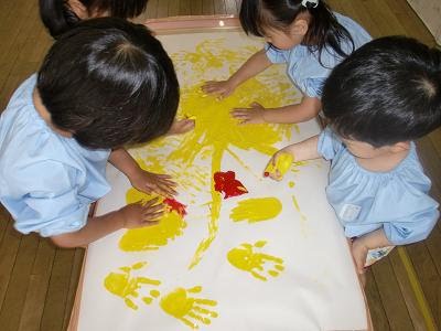 年少組は、今日はフィンガーペインティングを行いました。