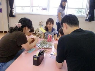 たぬきの「ぽんたくん」に作り方を教えてもらい、輪つなぎと短冊をを作り笹に飾りました。