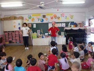 年少組は運動会で行うリズムのお話を1・2組合同で聞きました。
