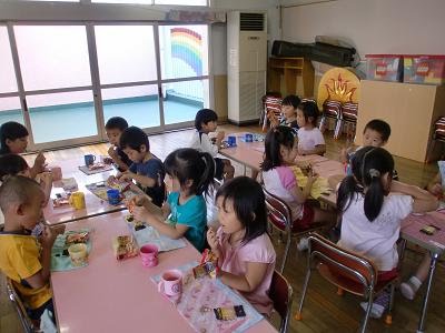その後、みんなでおやつ。準備もみんなで手分けして行います(テーブルを拭く、お茶を運ぶ、お菓子を配るなどなど、みんな張り切っていました)。