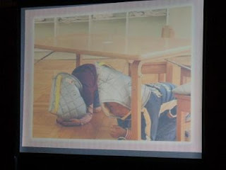 スライドの中には、地震が起こったときには、頭と顔を守るために「だんごむし」のポーズをしましょうとありました。 いつも防災頭巾がある場所にいるとは限りません。