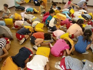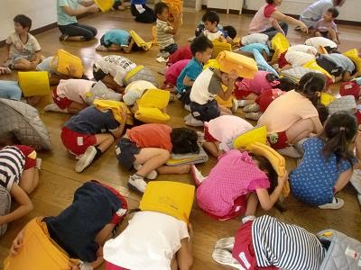 今まで、防災頭巾=被る だったので、新鮮でした。 毎学期1回避難訓練を行っています。