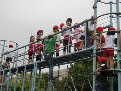 大きなアスレチックは、大人気。そして、鉄棒も。逆上がりが出来るような踏み台(?)のようなものを使って、逆上がりに挑戦している子もいました。