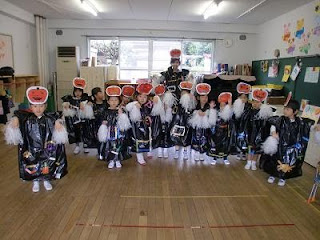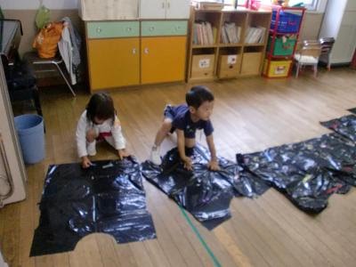 首と手をだす穴を開けた黒いビニール袋に、ビニールテープで飾り付けしてそれぞれ素敵な衣装をつくっています。