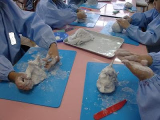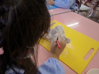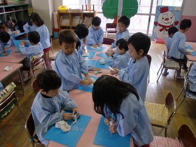 まずは、もらった紙粘土をよーくこねます。まるでパンやさんになったみたいに一生懸命こねてやわらかくしました。