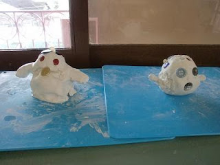 1学期にえのぐを染み込ませたトイレットペーパーをまるめて作った粘土で粘土人を作ったことがありましたが、今回は「紙粘土人」を作ったようです。