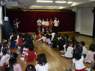前日に雨が降り、お庭が濡れていたのでお遊戯室で行いましたが、応援する人は上手に舞台に乗り、