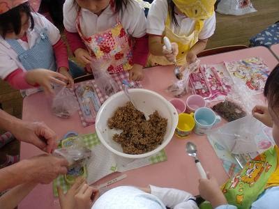 ビニールに自分で食べられる分のご飯をスプーンで入れて、オカカ昆布も入れて・・・