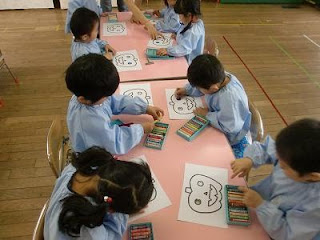 年少組の部屋に行くと、子ども達が一生懸命クレヨンで塗っています。