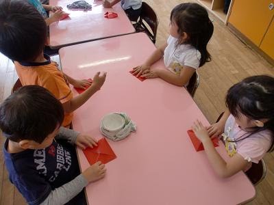 園での日々のようす 2010年10月8日2018年3月28日折り紙制作 年中組は今日折り紙制作をしていました。赤い折り紙で何を作っているかというと・・・「りんご」です。 とても簡単ですが、かわいい「りんご」が出来ました。出来たりんごは、木につけていました。今日は、セロテープを輪にしてつけていました。 食欲の秋。 見ていたら、りんごが食べたくなってきましたよ。 投稿ナビゲーション 前へ次へ 一覧へ戻る HOME 園での日々のようす 折り紙制作