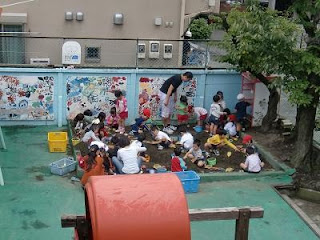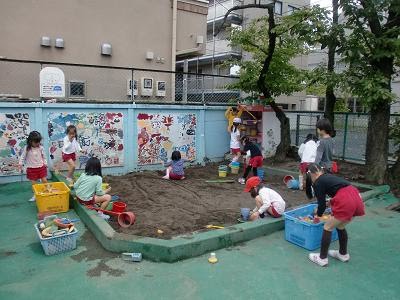 ここのところ、天気が悪かったのと、砂場の横にある桜の木に毛虫がいて、消毒などをした後ということもあり、砂場で遊べない日が続いていました。