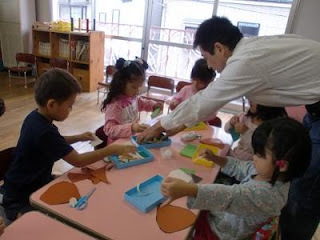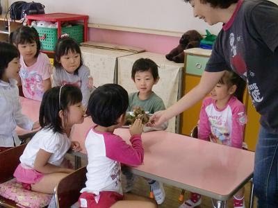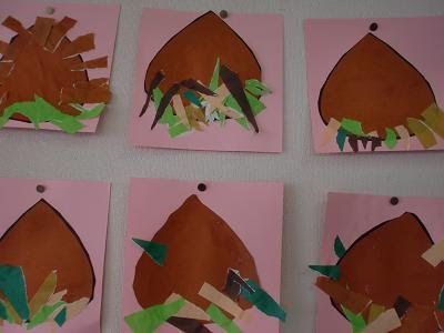 2010年10月1日2018年3月28日年中組~くり制作~ 年中組の部屋に行ってみると、先生が「栗」を子ども達に見せていました。触って見て「いたい!!」という子も。 そして、子ども達は「くり」制作に挑戦。はさみで栗の形を切り、栗のいがを、手で折り紙をちぎってのりで貼っていました。 秋の遠足で「くり」を見付けた子ども達。 とても可愛い「くり」が出来上がりましたよ。 投稿ナビゲーション 前へ次へ