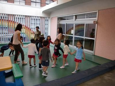 さて、この写真は、年長組の子どもと、今日来て下さった保護者の方たちが、とても楽しそうに「はないちもんめ」をしていたので、ついつい写真を撮ってしまいました。