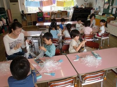 すずらんテープを裂いていますが、「何枚か重ねて裂くと良いよ」などと言いながら作っていました。