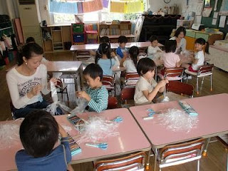 この写真は、「おばけ」の役の子が手につけるもの(ポンポンのようなもの)を作っています。