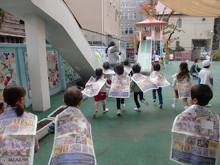 その後は、素敵な踊りも教えてもらって、元気に踊ったりもしたようです。 それから・・・新聞のマントをつけてお庭を元気いっぱい走り回りました。