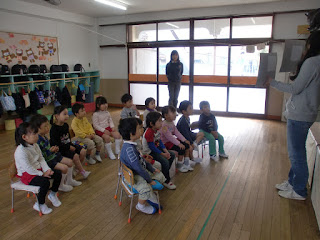 ひよこ1くみは先生に紙芝居をよんでもらっています。