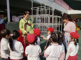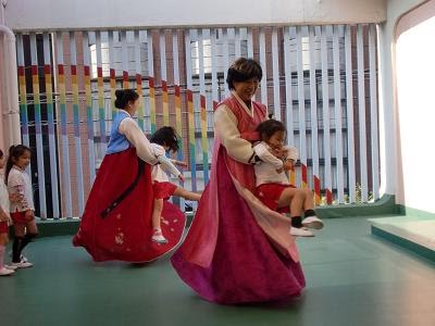 子供用のチョゴリを持ってきてくださったので、代表で一人ずつ(男の子・女の子・大人の女性)が着てみました。沢山の子どもが「着てみたい」と言っていましたが、時間の都合で一人ずつになってしまいました。着れなかった子、ごめんね。