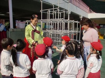 民族衣装「チマチョゴリ」を着た方がいらっしゃると、子ども達も興味津々。