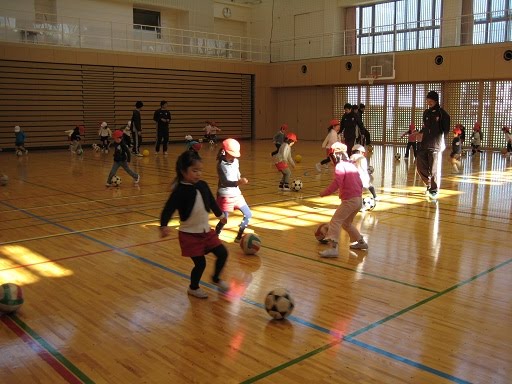 そのあと、ボールに親しむということで、片手にボールを持って、友達の持っているボールを落とすゲームなどをしました。そして、蹴ってみました。