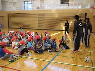 今日は、大豆戸FCのコーチが7名来て下さり、年中・年長の子ども達にサッカーを教えてくれました。