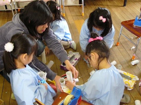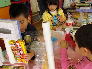 年中組は今日は、その廃材を組み合わせて見立てるということを行いました。