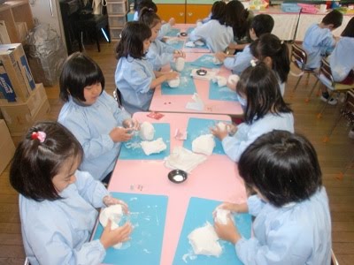 2011年1月18日2018年3月28日ゆきうさぎ作り~年長組~ 年長組の部屋に行くと、それぞれ一人ずつが1キロの紙粘土と格闘中。これから、ゆきうさぎを紙粘土で作るそうです。四角い紙粘土を手でこねながら形を作っています。 大きなうさぎを1匹にする子や、小さいうさぎも作る子がいました。形が出来たら、耳をつけて、自宅から持って来ていただいたボタンなどで目を作っていました。 一人ひとりが一生懸命考えながら作った「ゆきうさぎ」が出来上がりました。 とても可愛らしいうさぎが沢山です。 どうぞ見てあげてくださいね。 投稿ナビゲーション 前へ次へ