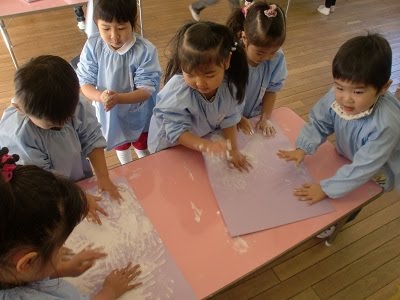 2011年1月13日2018年3月28日えのぐでペタペタ~ひよこぐみ~ ひよこぐみの部屋の前を通りかかると、なにやら楽しそうな空気が・・・入ってみると、子ども達が手のひらに白い絵の具をつけていました。 そして、テーブルの所に行き、色画用紙に白い色をつけています。 普段、自由画帳には白いクレヨンで描いても見えづらいのですが、今日は、色のついている画用紙。 とても喜んでいました。 白い色をつけた紙を、明日何かに変身させるようです。 お楽しみに!! 投稿ナビゲーション 前へ次へ